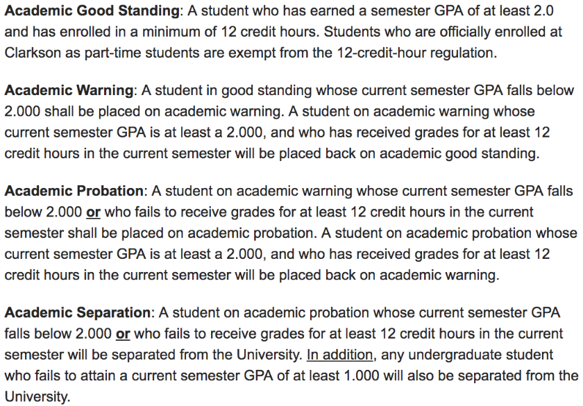 克拉克森大学 的所有学生都需要保持良好的学术地位(Academic Good Standing),而保持良好学术地位的最低标准是学生的GPA至少达到2.0,并且学生每学期至少注册12个学分课程(part-time的学生可以注册低于12个学分课程)。