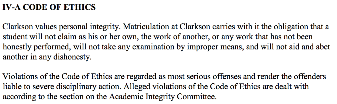 违反 克拉克森大学 学术诚信的情况包括但不限于所有形式的学术不诚实行为,包括作弊,捏造,抄袭和帮助并教唆他人采取不诚实的行为。