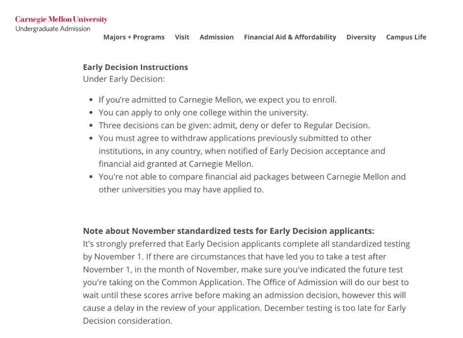 You must agree to withdraw applications previously submitted to other institutions, in any country, when notified of Early Decision acceptance and financial aid granted at Carnegie Mellon.