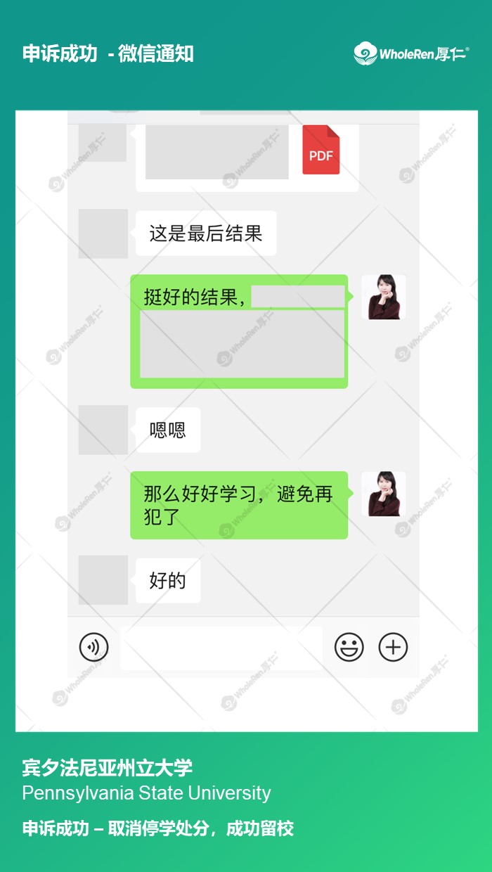 厚仁的专家老师在得知这不是X同学第一次违纪后,从学术政策方面进行解释,以及制定详细未来学习计划,请求学校降低处分。申诉难点是学生犯错的原因都是同一种,属于屡教不改,但是在专家老师的指导下,学校决定再给X同学一次留校察看的机会,取消停学处分。