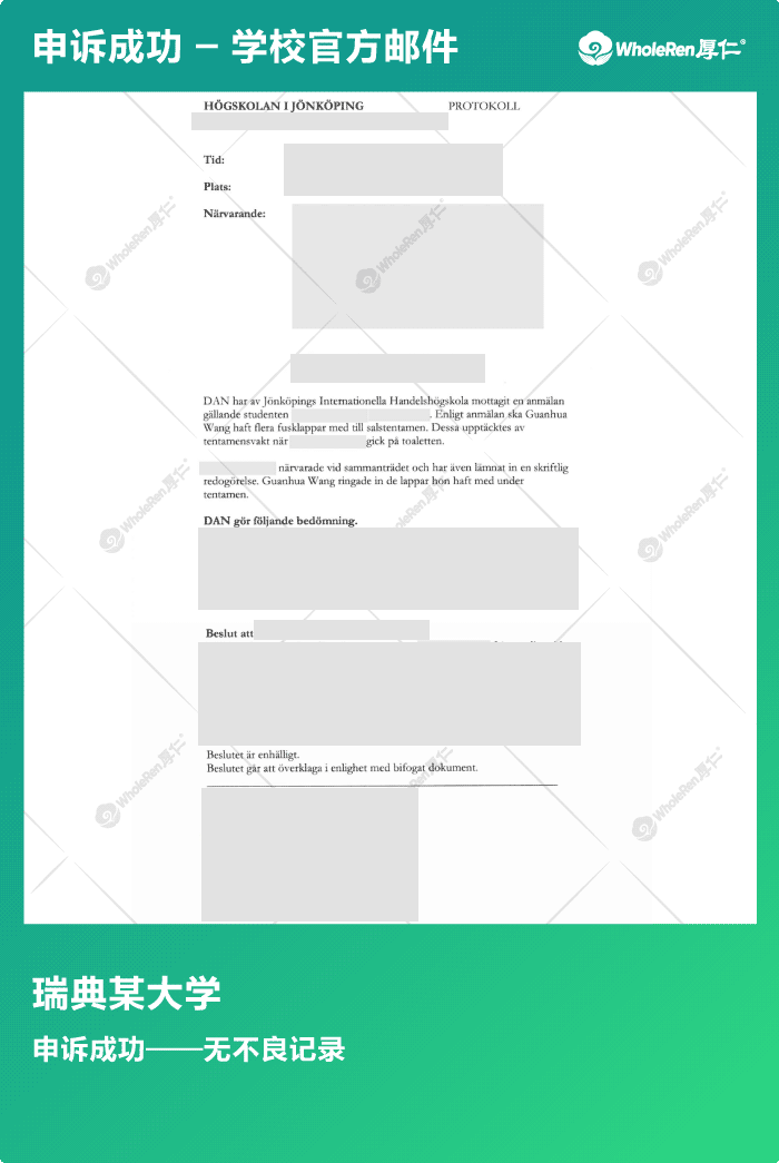 G同学就读于瑞典JIBS,在考试时因为帽子里有note被老师举报怀疑考试作弊。其实G同学并不知道帽子里有东西,但是学校却给了停学处分。