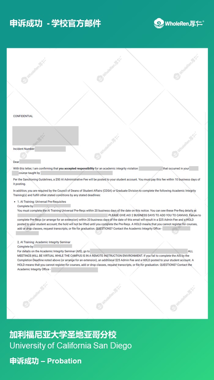 专家老师在了解学生的情况后,指导学生按学校流程解释了自己的情况,在诚恳道歉后请求减轻处分,最终获得了学校的理解,只有个Probation,避免了被停学。