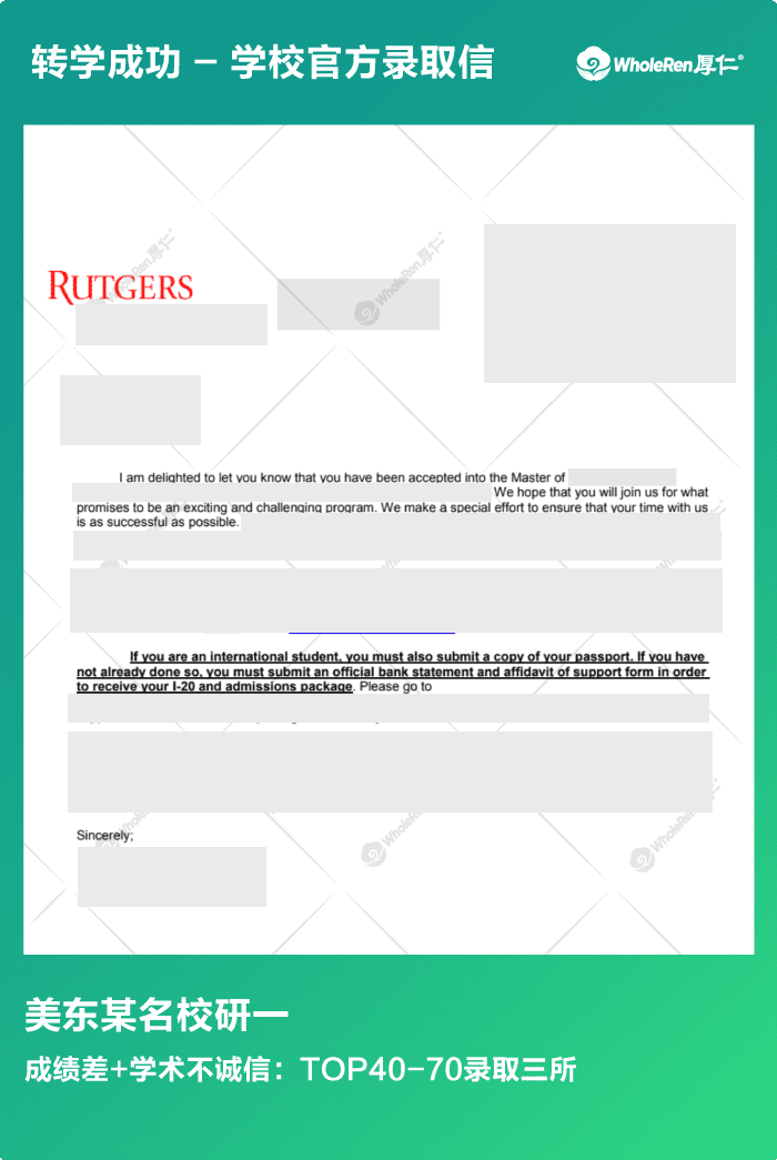 M同学在来美第一学期因为不懂如何withdraw课程,结果缺勤严重导致期末成绩不理想被留校察看;第二学期期末因为想提高成绩,在一次作业中抄袭了网上的内容最后被开除。 M同学非常后悔没有遵守学校的要求,担心自己的留学生涯就这样断送了。于是非常着急的找到我们,专家老师在详细了解M同学的情况后,根据M同学本科阶段的表现(本科GPA较高)以及在研究院学习中的认识最后帮助M同学拿到了Rutgers、Clark,杜兰大学3所学校排名在40-70之间的录取!