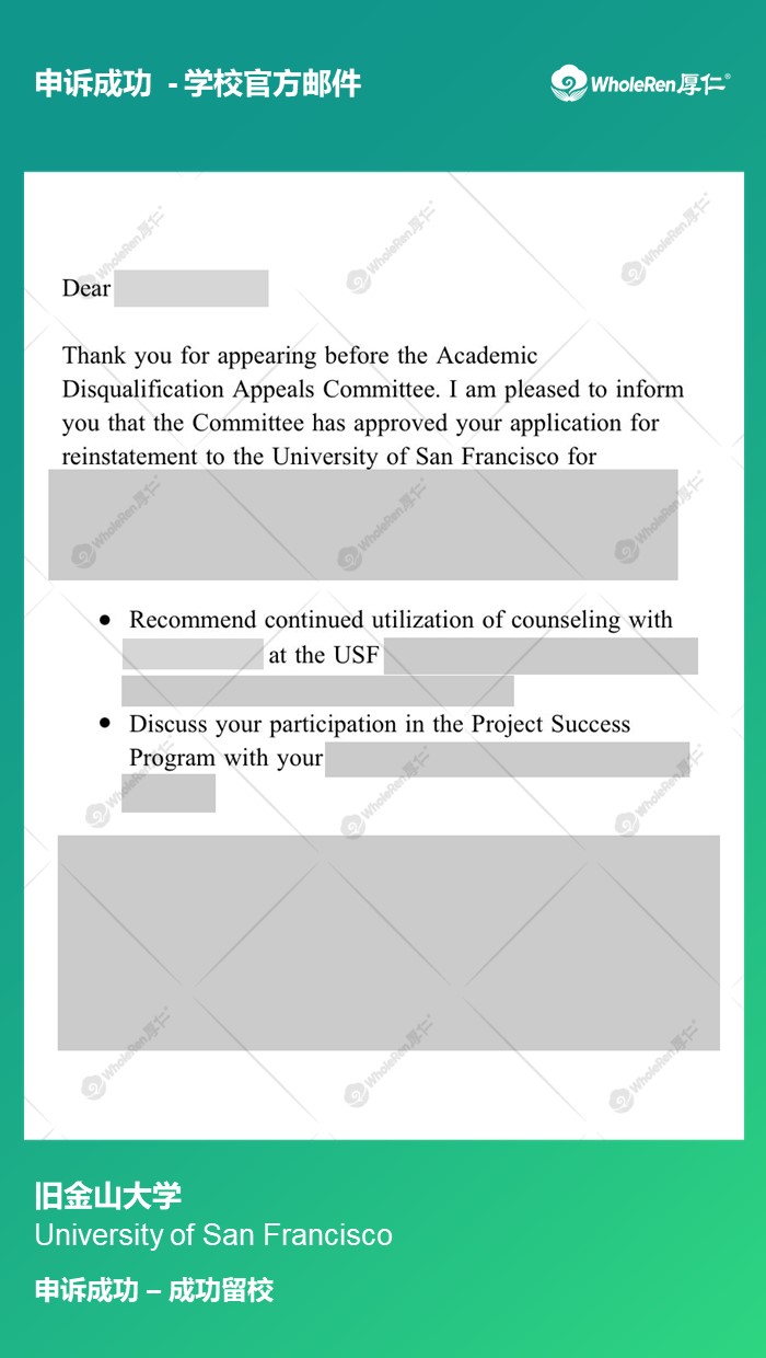 专家老师在分析了学生成绩不理想的原因后,指导学生完成优质申诉信,并制定了合理的学习规划改善成绩,最终申诉成功留校。