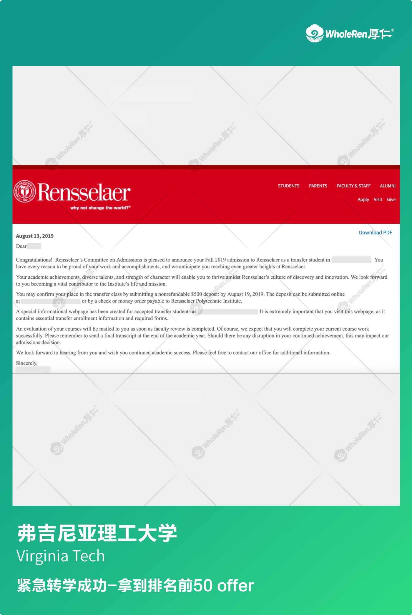 J同学在一门课中因为和同学有未经允许的课后讨论导致被警告,之后在一次考试中,J同学又被怀疑考试作弊导致被开除。后自己尝试申诉结果失败。 J同学非常希望能在美国完成学业,在专家老师的帮助下制定了紧急申请计划,并针对之前两次违纪情况进行详细的解释,并表达了自己的深刻认识和反省。在J同学与老师们的努力下,最终拿到了RPI等学校的录取信。