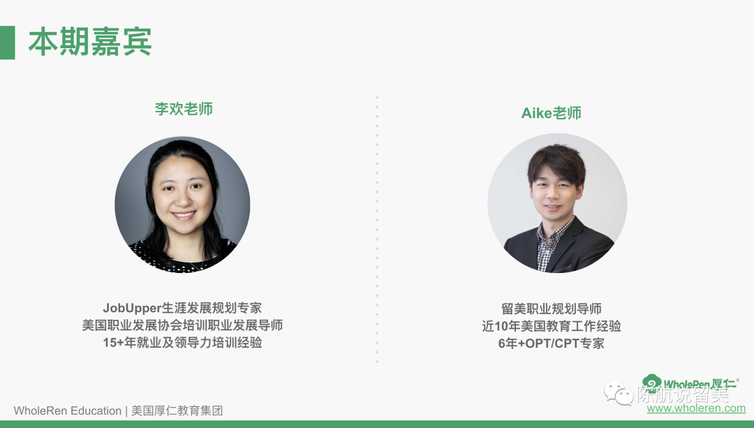 感谢各位家长同学观看上周六的《有效规划OPT实习就业》讲座,本次讲座的特邀嘉宾李欢老师是职尚行的生涯发展规划专家,Aike老师是OPT/CPT领域专家。三位位嘉宾携手,助大家走出实习就业第一步。