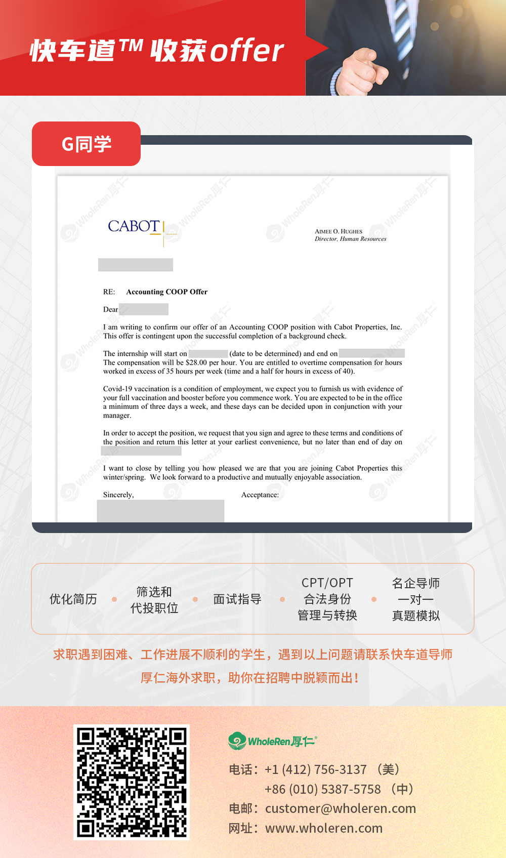 服务成果:跨国公司Cabot Properties 会计实习offer