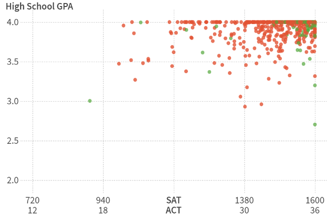 上图中,绿色代表被录取的学生成绩分布,红色代表被拒绝的学生成绩分布。学校要求学生高中阶段必须具备STEM方面的背景或特长,并对科学、工程和技术领域拥有浓厚的兴趣。