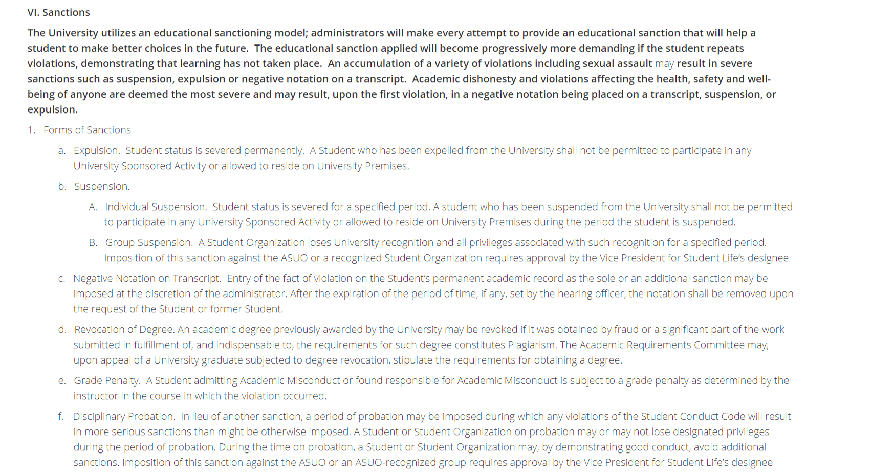 当违反学术诚信的规定,处罚将会根据情节严重程度进行以下的处分:书面谴责、学术诚信教育及培训、留校察看、成绩作废、学位的撤销、在成绩单注明不良记录、停学、开除(Conduct Reprimand、Educational Activity、Disciplinary Probation、Grade Penalty、Negative Notation on Transcript、Suspension、Expulsion)