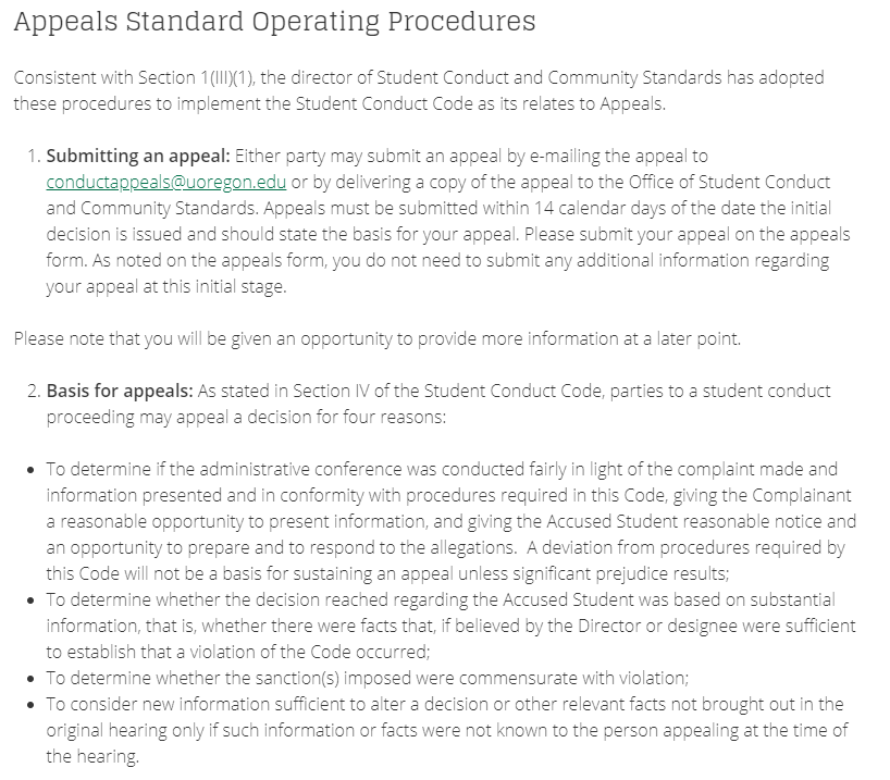 在收到学术诚信问题的处罚决定后,学生需要在14天内以邮件或书面的形式提交申诉申请。邮件需发送到conductappeals@uoregon.edu。 申诉需要满足以下其中一个条件:校方未按要求程序进行审理的;没有足够的证据证明学生违反学术诚信;处罚过于严厉;学生有新的证据证明未参与学术不诚信。