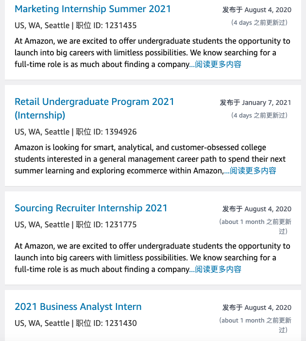 亚马逊应该是在疫情下迅猛发展的为数不多的公司之一,股票在2020年猛涨72%,而去年一年在全球招聘将近40万人,仅在华盛顿地区就招聘了1w6k多新员工。而在官网上,甚至从去年8月开始就陆续开放出来了计算机、BI商业智能,UIUX设计,软件/硬件工程师等方面相关的春招和暑期实习的信息,暑期是12周的全日制实习: