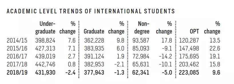 从以上三张表格我们可以看出,OPT学生总量增长强劲,2019年比去年增加了9.6%,达到223,085人。
