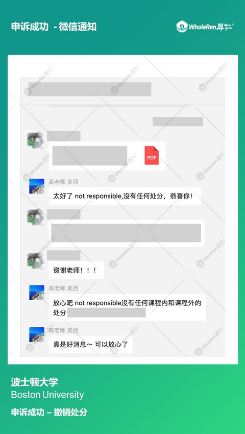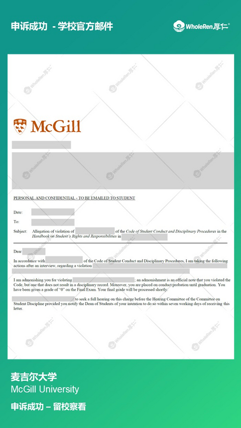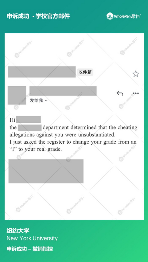 这类申诉需要充分证明自己没有作弊动机,并让老师相信自己。厚仁处理过很多类似的案例,专家老师会帮助学生分析误会产生的原因,指导学生准备支持性材料,并通过完成优质的申诉信证明学生的清白,最后成功申诉,避免处分。 我要立刻咨询! -