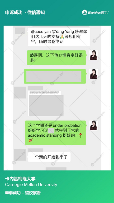 W同学因为时间安排不合理,导致实习占据了多数时间,放松了学业,某一学期的GPA低于2.0,学校直接发来了停学通知。 专家老师在了解学生的学习情况后,指导学生提交申诉信,做好合理的学习规划,并证明自己的学习能力,最终申诉成功留校,成绩达标即可撤销probation记录。