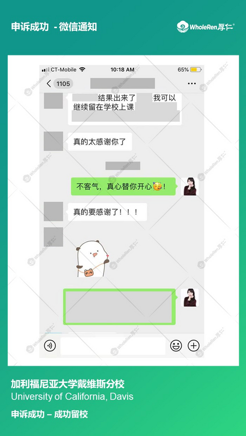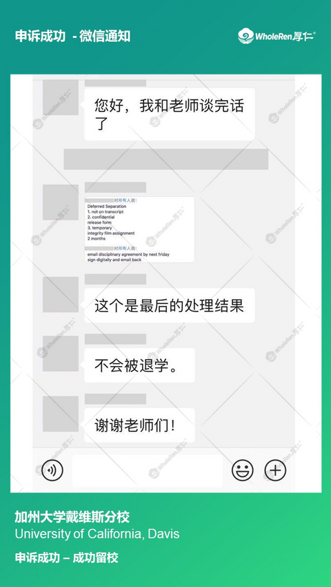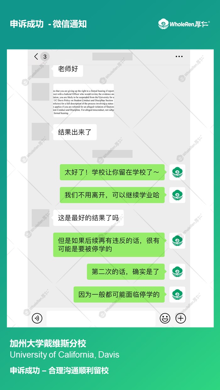 X同学在来到美国后因为课程选择不当,导致一直跟不上老师的教学节奏,最终因为GPA不达标被学校开除。 在进入服务的当天便是申诉的截止日,专家老师快速帮助学生理清申诉要点,指导学生完成优质申诉信,仅仅一天的时间指导学生申诉成功,X同学继续留校。