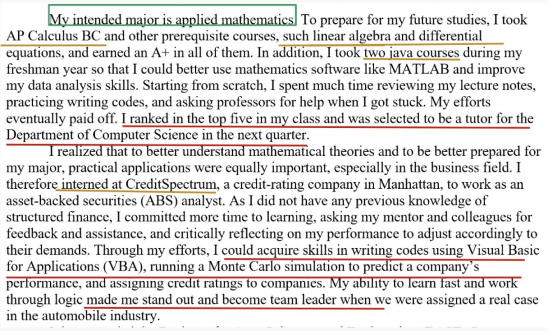 黄色划线部分:展现了该申请学生在专业学习上所做的准备(linear algebra,differential equations,two Java courses)以及之前相关的实习经历;