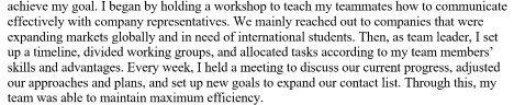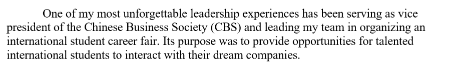 开头两句就很明确的说了自己担任的职位和做过的事情:担任Chinese Business Society的副主席,带领自己的团队举办了一次招聘会。