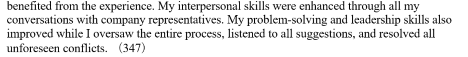 红色划线部分:列出了自己在学校里获得的荣誉(”top five in my class”,”being a student tutor”)和学习到的技能(using VBA,running a Monte Carlo,a team leader)。