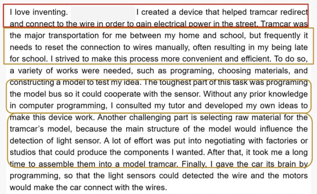 黄框部分:说明自己为什么要做这个小发明(电车断电会影响自己的时间),以及在这个过程中遇到的问题,比如需要编程的技能,做模型的时候需要和厂家去谈原材料的选择和成本等问题。这些学生都用非常详实的细节描述了问题的解决办法。