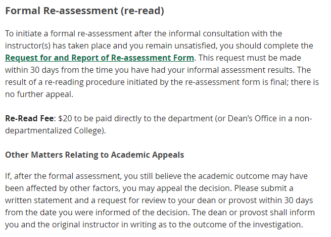 在与任课老师沟通后,如果学生认定自己的成绩依然存在错误或者异议没有充分的解决,学生有权利提交正式的成绩申诉。关于成绩的申诉,学生需要在与任课老师沟通后的30天内提交至课程所在院系Dean’s Office。学生应该在申诉中详细解释申诉的原因,与任课老师沟通的过程,以及提交相应的证据和$20申诉费用。在收到学生的成绩申诉后,学院会组织相应的老师在充分调查后做出答复。