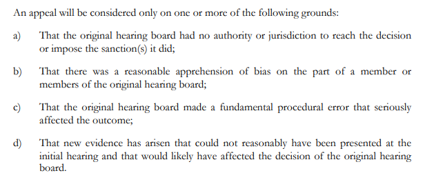 一旦学生因违反学术不诚信而受到处罚,学生仍然有申诉的权利。学生的申诉必须收到处罚通知的30天内,以书面的形式向the University Secretary提出。申诉必须基于以下几种理由: