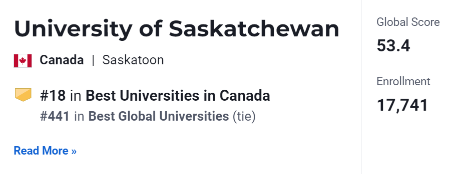 2024年USnews 加拿大大学排名中,萨省大学位于第18名。