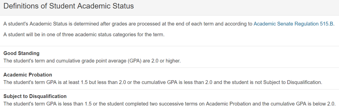 如果学生的学期平均GPA达到1.5但低于2.0,或者总GPA低于2.0,再或者没有修习足够学分的课程,则会被学校留校察看(probation)。如果学生的学期平均GPA低于1.5,或者连续两个学期在留校察看状态,且总GPA低于2.0,则可能面临开除(disqualification)。学期GPA和总GPA都高于2.0时,留校察看状态解除。对于研究生,累计GPA低于3.0或者超过8个学分的课程取得F或U grade,则有可能被开除。