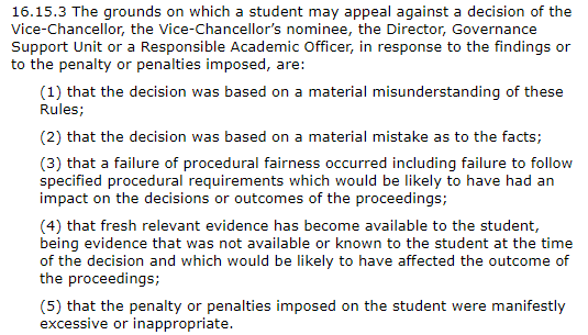 对于学术不诚信行为的处罚,学生有申诉的权利。学生可以在收到处罚决定的20个工作日内,向所在院系的Director,Governance Support Unit提出申请。学生的申诉通常基于以下几个理由: