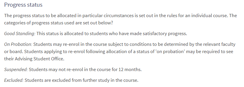 西澳大学与大部分的澳洲高校一样,要求本科生必须通过至少50%的课程学术成绩才算合格,即Satisfactory Progress。如果学生无法满足最低的学术要求,则会被视为 Unsatisfacory Progress,同时也将面临来自学校相应的学术处罚。